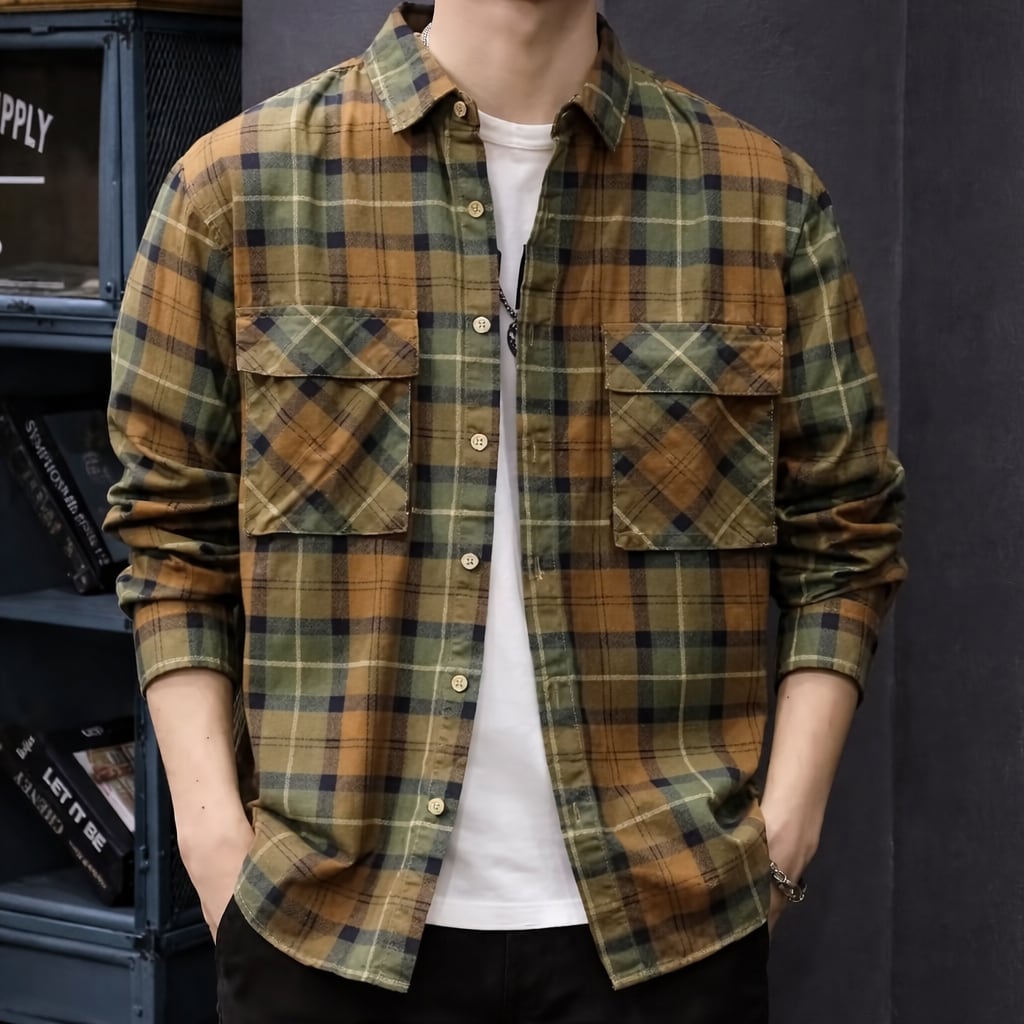 チェック柄 長袖 シャツ パッチポケット付 2 カラー H00057