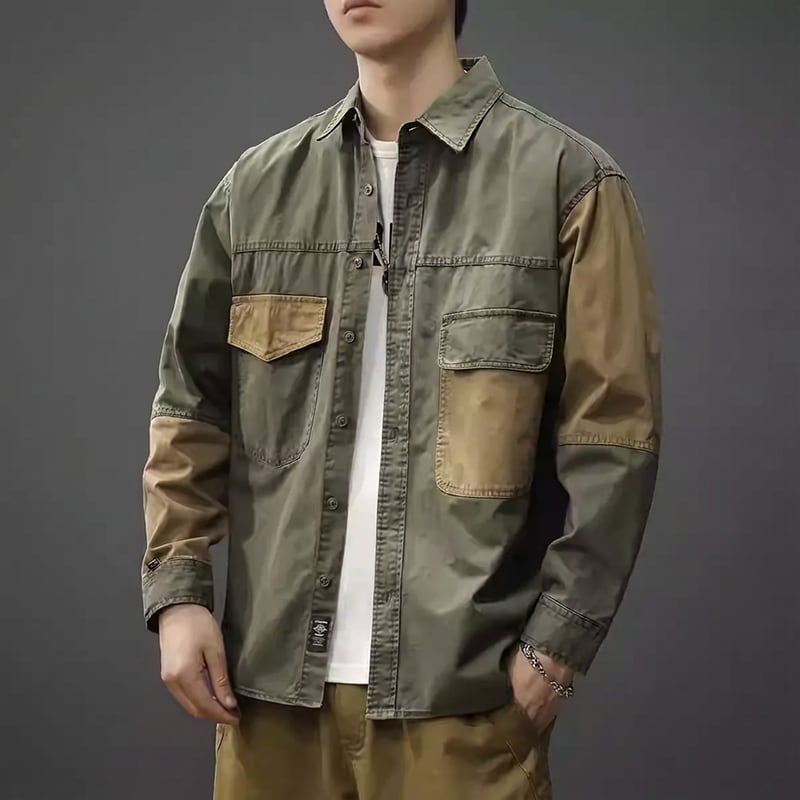 左右の胸元にはパッチポケットが配置され、デザインのアクセントになっています。