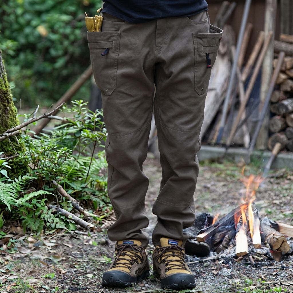 難燃ファブリックファイヤーシールドを使用した焚火パンツ。