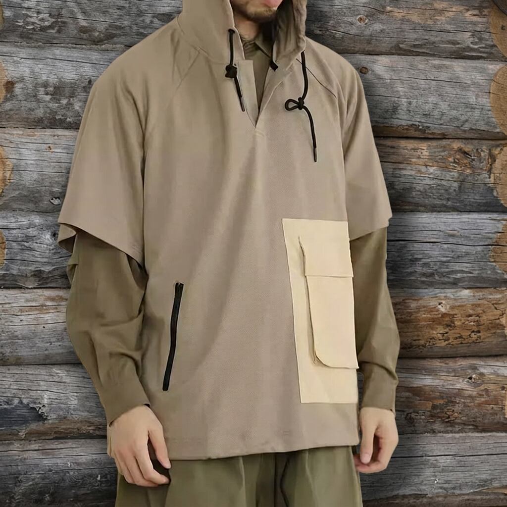 アウトドアシーンで活躍する、フード付き半袖プルオーバー。