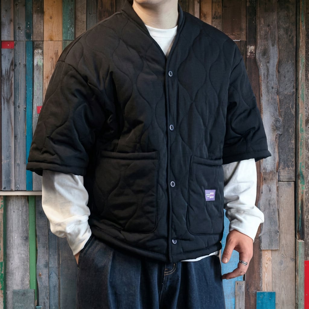 温度調節に困る季節の変わり目に活躍する、キルティングジャケットはいかがでしょうか。オーバーサイズなので、ゆったりと着こなせます。半袖デザインで、インナーとのレイヤードも楽しめます。両サイドにはパッチポケット付きで、ちょっとした小物も収納可能です。