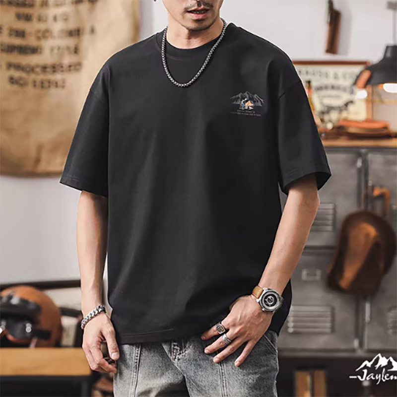 キャンプシーンを彷彿とさせるグラフィックが目を引くTシャツです。