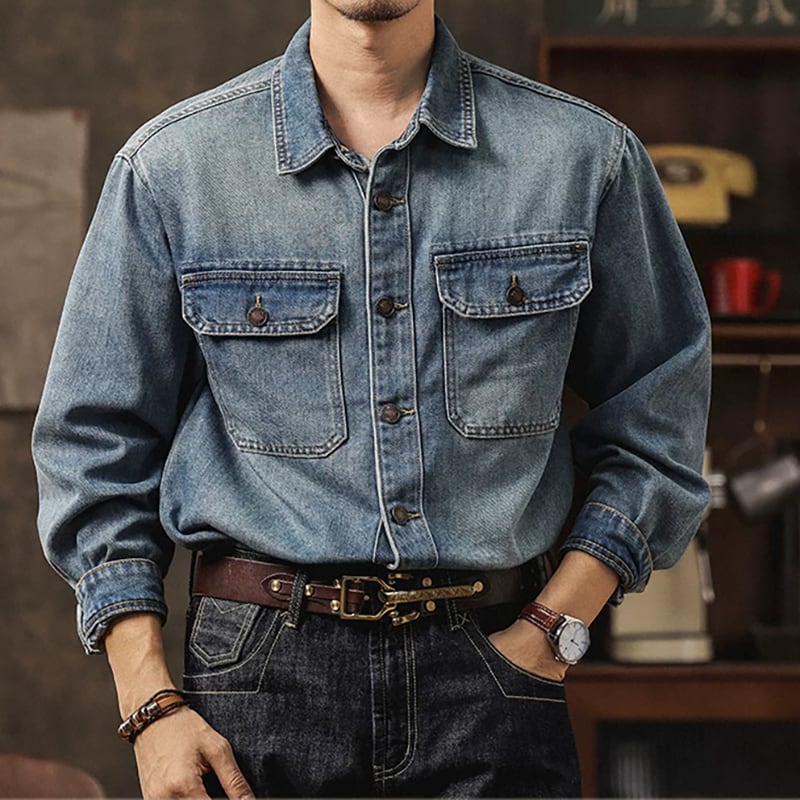 ヴィンテージ感漂うウォッシュ加工が魅力のメンズ長袖デニムシャツ。